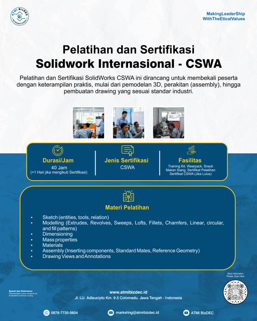 Program Pelatihan dan Sertifikasi SolidWorks CSWA ini dirancang untuk membekali peserta dengan keterampilan praktis, mulai dari pemodelan 3D, perakitan (assembly), hingga pembuatan drawing yang sesuai standar industri. Dengan sertifikat internasional yang diakui dunia, Anda akan memiliki keunggulan kompetitif untuk memasuki pasar kerja global.